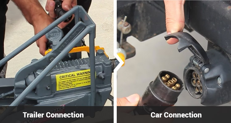 The next step is to connect the wiring lead from the trailer to your vehicle. First connect the lead from the trailer plug, then attach the connector it to your vehicles plug, making sure to correctly line up all pins.